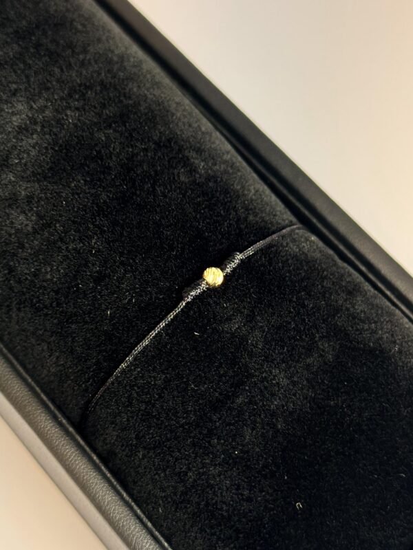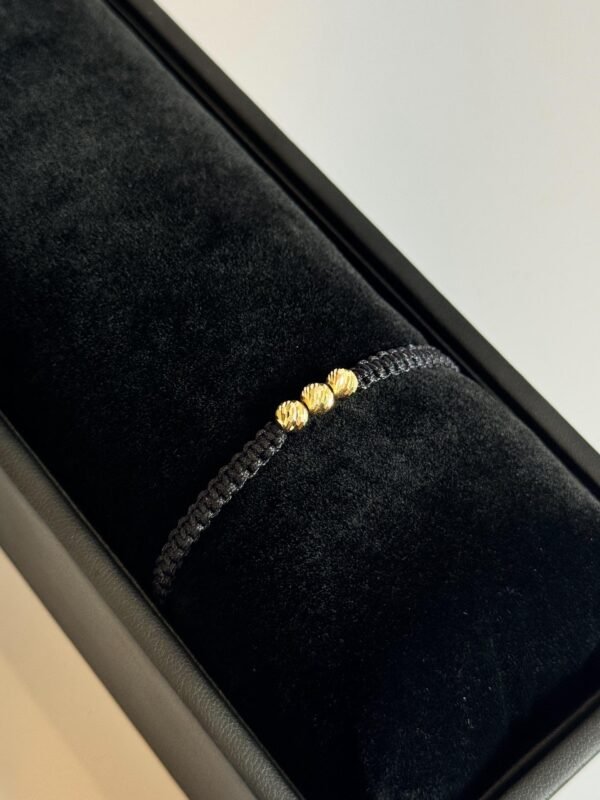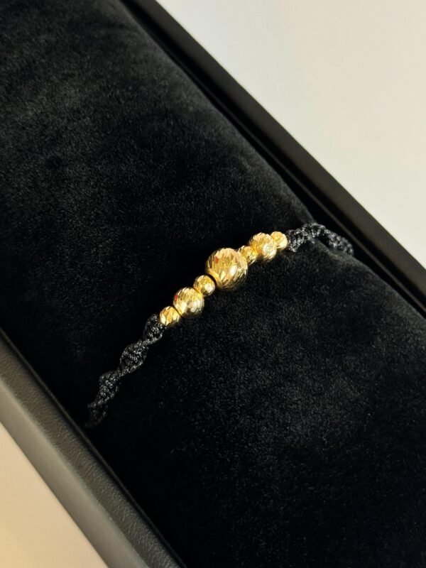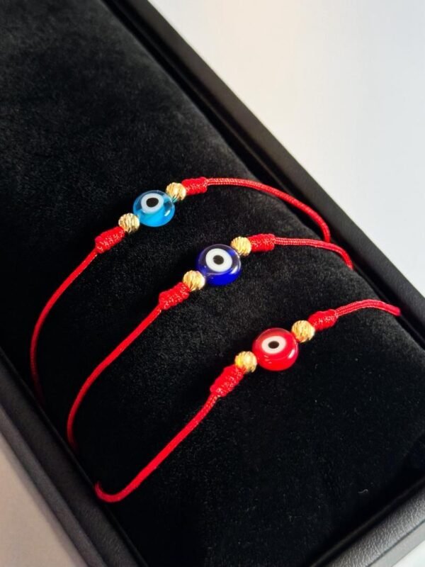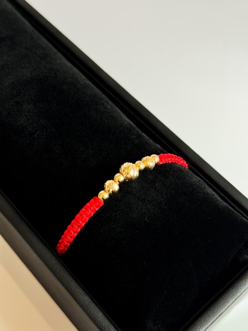 Pulsera tejida en hilo chino rojo con balín central diamantado #8, 4 balines lisas #3 y 2 balines diamantados #4